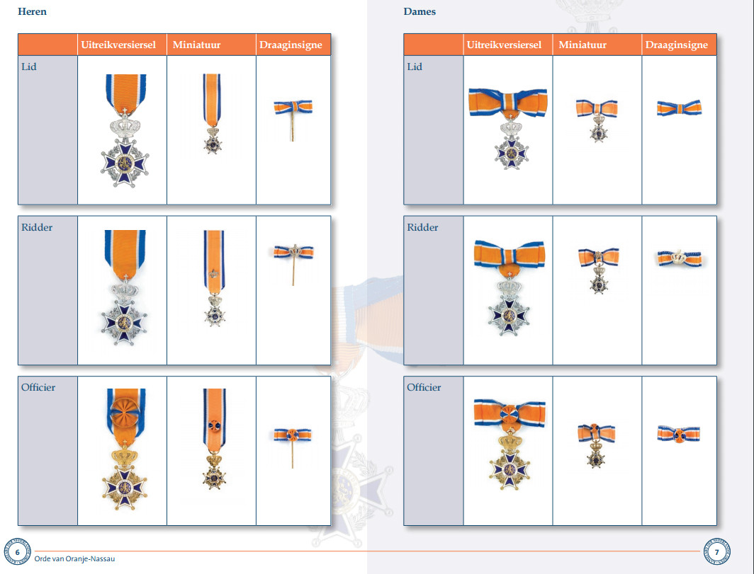 Overzicht der nederlandse en militaire onderscheidingen, herinneringsmedailles en door de overheid niet verleende, doch wel erkende onderscheidingen, vermeld in de volgorde, zoals deze is voorgeschreven voor militairen koninklijke onderscheiding. Dit in tegenstelling tot de graad lid waar het vooral gaat om personen die lokaal verdienstelijk zijn (dus binnen de gemeentegrenzen).